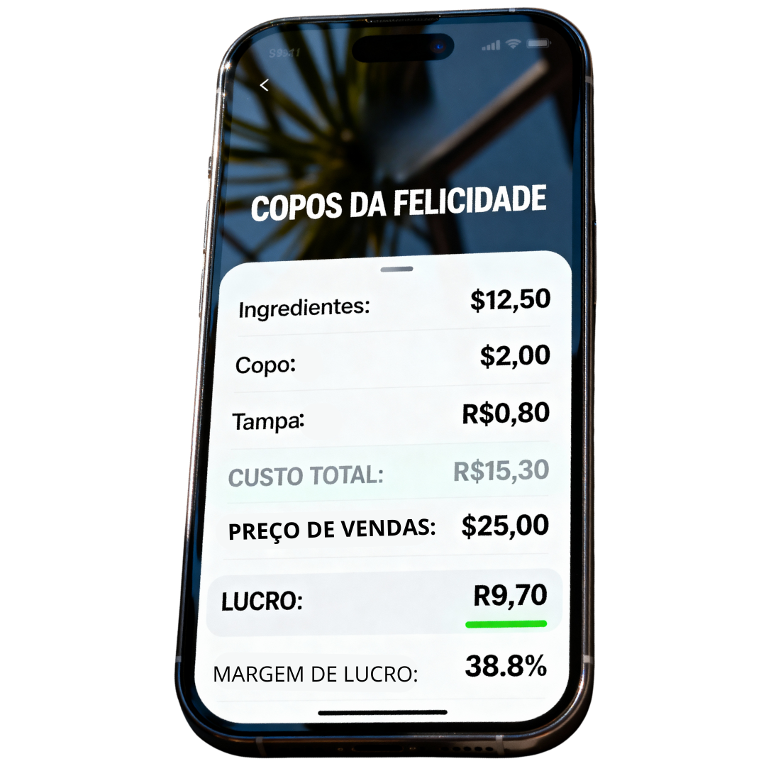No kit, você recebe uma tabela de precificação que ensina exatamente quanto cobrar para garantir um lucro real, sem medo de errar. Além disso, há videoaulas com técnicas de vendas para ajudar a vender seus copos com facilidade e constância.